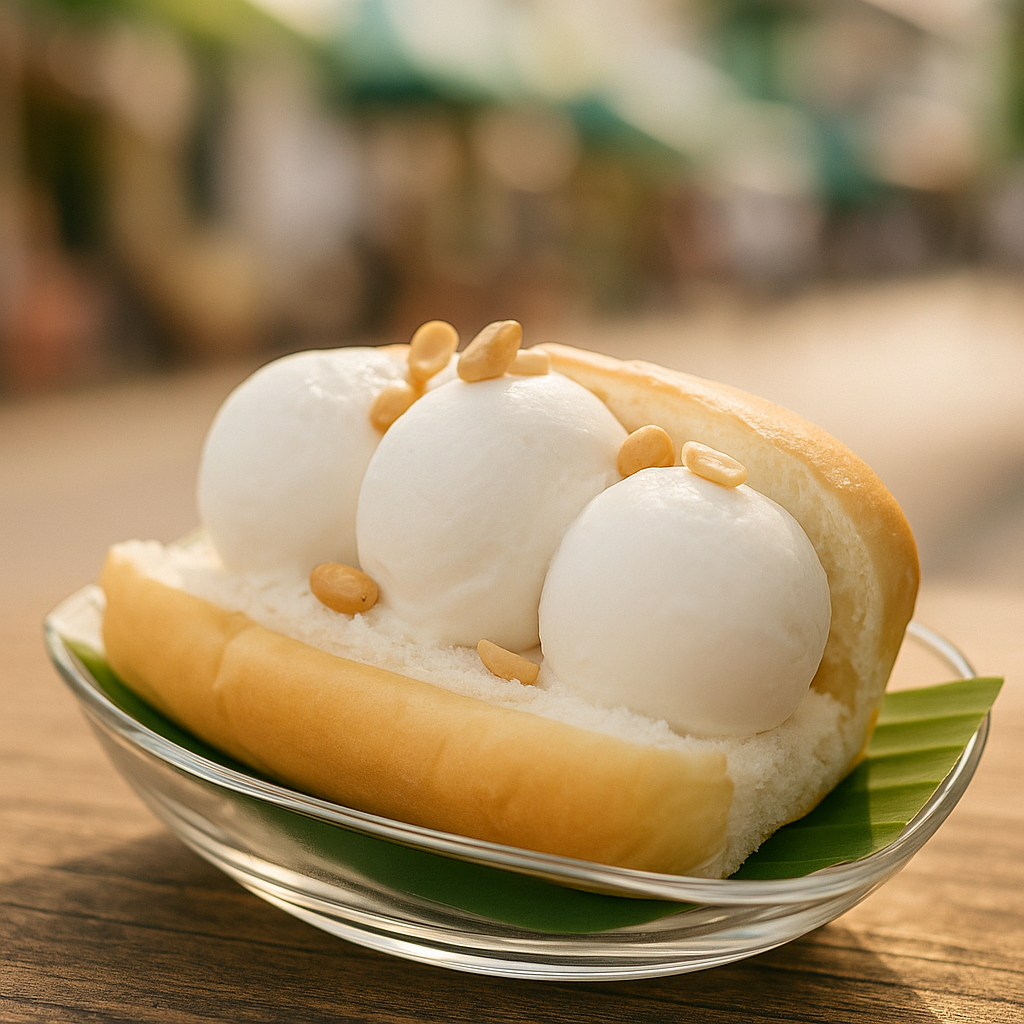 [1] Soft Thai-style sandwich bun (ขนมปังกะโหลก): A mildly flavored soft bun, typically split lengthwise, used to serve coconut milk ice cream. Its neutral taste helps highlight the richness of the ice cream and toppings. Similar in shape to a hot dog bun, but less sweet and without crusty edges.
